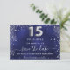 Ein trendiger Save the Date für eine Quinceañera, 15. Geburtstagsfeier. Ein marineblau Hintergrund mit Imitaten verziert silbernen Glitzer, Glitzern. Die blaue Farbe ist ungleichmäßig. Personalisieren und fügen Sie Datum und Name/Alter hinzu. Der Text: Save the Date ist mit einem großen angesagten, handgeschriebenen Stilskript geschrieben. Nummer 15 mit einem silbernen Schriftart im Ballonstil.