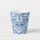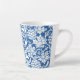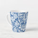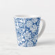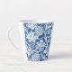 Eine Tasse mit Latte-Kaffee mit einem Blumenmuster von William Morris (18134-1896) mit dem Titel Sonnenblume (1879) in einer klassisch blauen und weißen Farbpalette. Große Sonnenblumen mit anmutigen Weinreben und Blätter. Er war ein britischer Künstler während der Kunst- und Handwerkszeit, der Tapeten und Textilien entwarf.