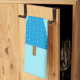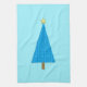 Ein einfaches, modernes Handtuch mit klassischen Weihnachtsbaummotiven, blaue, satin-strukturierte Sterne auf einem aqua-blauen Hintergrund