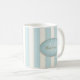 Diese individuelle Tasse hat ein Elfenbeinmonogramm in einem ovalen Rahmen auf einem Hintergrund von breiten Streifen in blassblau und antiken Weiß, die personalisiert sein können, um Ihren Namen, Familiennamen zu zeigen oder Ihr Unternehmen zu fördern.