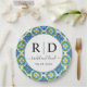 Blaue und gelbe Fliesen Hochzeitsplatte. Dieses charmante, mediterran inspirierte Hochzeitsdesign strahlt ein lebendiges und fröhliches Ambiente aus, das an die sonnigen italienischen Küsten erinnert. Das Design ist raffiniert und spielerisch und eignet sich perfekt für eine Feier, die die Wärme und Schönheit eines italienischen Sommers einfangen soll. Die Initialen des Paares und ihre Namen sind in einem runden Rahmen ordentlich platziert, sodass alle wesentlichen Details leicht lesbar und stilvoll präsentiert werden können. Die Abdeckung wurde unter Verwendung einiger Elemente von Freepik.com entworfen