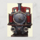 Vintager Zug im Steampunkstil in Rot und Blau mit Rädern, Fenstern, Nasen, Nüssen und Bolzen, Metallringen, Fassade aus rotem Metall und graublaue Fassade und sieht wie ein Spielzeug aus. Farbfotografie an der Vorderseite eines antiken Dampfzuges in glatt metallisch gedämpften Farben in Rot und Blues.