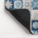 Ein Quilt zeigt komplexe Muster, die an Schneeflocken erinnern. Jeder Block zeichnet sich durch ein einzigartiges blau-weißes Design aus