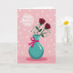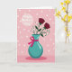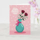 Diese Karte zeigt ein stilisiertes Blumenbouquet, das in einer eleganten türkisfarbenen Vase arrangiert ist, die sich in der unteren Hälfte des Designs befindet und einen sanften Lichtschein einfängt, wie ein zärtlicher Blick, den Freunde teilen ❤️. Ein leuchtend fuchsienfarbenes Band umschlingt den Hals der Vase und bildet eine ordentliche Schleife, die einen geschenkartigen Touch hinzufügt, der liebevoll wirkt, ohne übertrieben zu sein. Zwei große, tief burgunderrote Blüten ragen darüber hinaus, ihre gerundeten Blütenblätter neigen sich leicht zueinander, als ob sie sich in einem stillen, fürsorglichen Moment befänden. Dunkelgrüne Blätter und dünne Zweige mit winzigen weißen Blüten füllen das Arrangement aus und geben dem Bouquet einen leichten, luftigen Kontrast. Der Hintergrund ist pastellrosa mit weich verblassenden weißen Kreisen, die umher verstreut sind und eine ruhige, traumhafte Atmosphäre schaffen. Oben links befindet sich ein weißer Kreis mit den