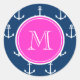 Blaue, weiße Ankermuster, Hot-Pink-Monogramm Runder Aufkleber