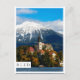 Postkarte der kleinen Insel mit Kirchenkirche, umgeben von Herbstfarben im Bled-See, mit im Hintergrund Schnee auf den Gipfeln der Julischen Alpen im Herbst in Slowenien mit einem weißen Rand und der Probe: 'Bled'.