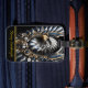 Ein stilisierter Adler mit silber-, gold- und blauen Federn aus Metall, eingerahmt in einem verzierten Kreis.