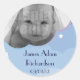 Blauer Aufkleber mit Foto, Name und Geburtsdatum des Babys.