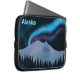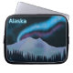Lila und blaue Nordlichter leuchten in einer kalten Nacht in Alaska über schneebedeckte Berge