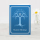 Pessach-Karte mit einem verzierten Baum mit Ästen, die einen weißen Stern von David auf blauem Gradientenhintergrund umgeben. Weißer Text: Pessach-Segnungen. Weitere Produkte, Kundenanfragen, Vertrieb & News finden Sie auf Facebook: @chaistationery