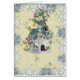 Beige Hintergrund mit grünem Efeu und weißem Blumenmuster und blaue und weiße Hydrangeakartengrenze umrandet die Karte. Zentrales Bild ist von einem hängenden Birdhouse/von einem Gazebo mit kaskadierenveilchen, Lilien, Hydrangeas und anderen Arten Blumen. Kleiner Vogel ist innerhalb des Gazebo, der auf einem tuffett sitzt. Innerhalb des freien Raumes.