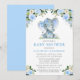 Watercolor Blue White Floral Baby Elephant mit einer Blue Bow Baby Dusche Einladung. Freuen Sie sich auf hübsche Aquarellblau-Rose, weiße Blume und botanische Vegetation. Blau und Silbertext.