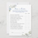 Blauer Blumengarten "Over or Under" zum Herunterladen einer Babyduschspielkarte mit atemberaubendem Blumendesign in Aquarellfarben mit zarten pastellfarbenen, staubblauen und weißen Blume wie Hydrangea. Der spielerisch handgeschriebene Schriftart fügt dem Design eine charmante Vintage Touch hinzu und ergänzt die Blumen perfekt.