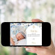 Fügen Sie Ihr eigenes Foto in vertikaler Größe hinzu. Ein Baby-blauer, bogenförmiger Rahmen aus Foto. Weiße Hintergrundfarbe, mit blauen Foralen und Blume geschmückt. Personalisieren und fügen Sie einen Namen und Details.