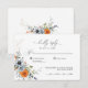 Dieses RSVP-Angebot für Hochzeiten zeichnet sich durch ein wunderschönes Design von blauen und orangefarbenen Blume aus, das ihm ein lebendiges und elegantes Aussehen verleiht. Das Design ist perfekt für Paare, die eine klassische und dennoch moderne Einladung suchen. Die Mischung aus Blau und Orange ist auffallend und auffallend, während das Blumendesign eine romantische und zarte Touch verleiht. Der Text ist bearbeitbar, sodass Sie ihn an Ihre Bedürfnisse anpassen können.