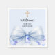 Eine hellblaue Hintergrundfarbe. Die Einrichtung ist mit einem großen blauen Bogen, Blumenblättern und einem goldenen Kreuz geschmückt. Personalisieren Sie den Namen und das Datum und fügen Sie diese hinzu.