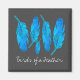 Hübsches blaues Boho Federdesign von blauen Aquarellfedern vor dunkelgrauem Hintergrund. Schönes tiefblaues Design mit einem boho-Ambiente. Vögel eines Federziels