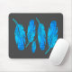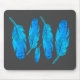 Hübsches blaues Boho Federdesign von blauen Aquarellfedern vor dunkelgrauem Hintergrund. Schönes tiefblaues Design mit einem boho-Ambiente.