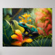 Blauer Dartfrosch illustriert in den Ästen von Bäumen umgeben von lebhaften tropischen Blume in einem tropischen Regenwald.