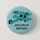 blauer Doppeldeckergeburtstagsjungen-Buttonknopf, der blaues Vintages Flugzeug auf kundengerechter Hintergrundfarbe mit editable Bereich für Text kennzeichnet - eine große Idee für Geburtstags-Gastgeschenke oder für das Unterscheiden eines Party Ihrer kleinen Gäste oder die Unterteilung sie in Spielteams, als Veränderung dieses Flugzeug wird auch mit einem roten Flugzeug angeboten