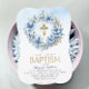 Moderne, elegante Foto Taufe Einladung. Die Einladung enthält das Typografie-Skript ''Taufe'' in Goldschrift, einen blauen und goldblühenden Kranz mit Goldkreuz auf einem staubblauen Aquarellhintergrund. Persönlich gestalten Sie das Ganze mit Festen und einem Single-Foto auf der Rückseite.