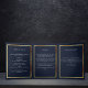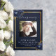 Ein elegantes Dreifachprogramm. Ein marineblau Hintergrund, ein goldener Rahmen aus Imitaten, blaue Blumen und Platz für ein Foto. Personalisieren und hinzufügen von Namen, Daten und Text.