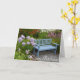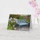 Blaue Holzbank im Frühjahrsgarten Grußkarte