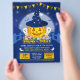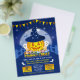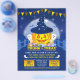 Halloween Trunk oder Leckerei Einladung Flyer bietet einen kinderfreundlichen niedlichen Kürbis mit einem blauen Hut gefüllt mit funkelnd Sternen, weiße Geister, Bonbons, ein farbenfroher Banner, ein leuchtender irisierender Mond, Wolken und funkelnd Sterne mit einem Zaun und Pfad.