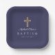 Personalisierte Navy Blue Script Religious Cross Boy Taufe Papier Teller.