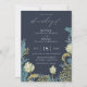 Englische Blume und Blattwerk in Blautönen und Beige-Alten, elegante Hochzeitsreise. Hintergrundfarbe, in Oxford Blau, auf der Vorderseite der Karte angezeigt, kann angepasst werden. Die Karte verfügt über eine passende Mustersicherung.