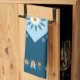 Dieses helle und farbenfrohe Küchentücher verwendet Volkskunst-Bilder von einer Eule, einer Tulpe und einer Sonne als Rahmen an jedem Ende. In der Mitte befindet sich eine Diamantform mit Blumenmotiv in der Mitte. Die Farbtöne sind blau und orange, die Touch weiß. Die Ränder und die Mittelbilder werden auf einem dunkelblauen Hintergrund platziert. Die Ränder werden umgekehrt, sodass die Bilder bei gefaltetem Bild richtig auftauchen, egal, welches Ende gerade liegt.