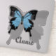 Der blaugedeckte Schmetterling mit dem Flügel fliegt über seinen Schatten. Im Schatten ein Platz für einen Namen, "Annie" und kann für Sie personalisiert sein.