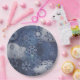 Schneeflocken von blau und weiß auf weißen Wolken unter einem Sternenhimmel.
