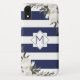 Navy Blau Streifen florale Monogramm mit weißem Rosendesign. Trendy und stilvoll, fügen Sie einfach Ihren personalisierten Anfangsbuchstaben hinzu. Macht ein modernes und elegantes Geschenk für sie, Mütter, Großmütter, Tanten, Freundinnen und mehr. Diese feminine Elegant und mädchenhaft aussehende paarweise dunkelblaue und weiße horizontale Streifen, mit Vintagen weißen Rosen, Blume und einem geometrischen quadratischen Rahmen. Personalisierte mit Monogramm Telefonzelle! ~ Karo mein Shop zu sehen, die gesamte Sammlung mit diesem Design!