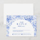 Ein elegantes Design für eine Abschlussfeier mit einer zarten blauen Toile-Blumenbordüre, inspiriert von klassischem europäischem Porzellan und alten botanischen Drucken. Die komplizierten Blumen umrahmen eine saubere, gebogene zentrale Tafel und schaffen eine raffinierte und zeitlose Komposition, die den Namen des Absolventen und die Details der Veranstaltung schön hervorhebt. Sanfte Blautöne vor einem knackigen Elfenbeingrund verleihen dem Design ein ausgeklügeltes und dennoch festliches Gefühl. Perfekt für eine stilvolle Abschlussfeier mit einer klassischen, romantischen Ästhetik.