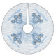 Ein hübsches Muster kleidet oben Ihren Feiertagsbaum. Dieser Entwurf hat einen weißen Hintergrund mit hellgrauen diagonalen Streifen. Es gibt eine wiederholende Grafik einer Eisblauschneeflocke mit vier Verzierungen, die von einem blauen Band hängen - die Verzierungen wechseln Blau und Silber ab. Unter jedem sagt es frohe Weihnachten.