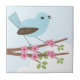 Blauer Vogel auf einem rosa blühenden Baumzweig. Dekorative Keramik Fliesen.