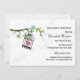 Eine niedliche Einladung mit blauem Vogel, Vogelkäfig mit dem rosa Herzen, das von der Baumniederlassung mit grünem Blätter schwingt. Hintergrund hat hellblaue zerstreute Blumen. Fertigen Sie für jede mögliche Gelegenheit besonders an.