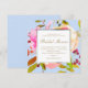 Wunderschönes Blumenstrauß mit Grünpflanzen, Beeren und Imitaten, goldener Rahmen auf der Vorderseite der Karte, lebendiger blauer Hintergrund mit weißem Polka Dotmuster auf der Rückseite dieser trendigen und eleganten Brautdusche.