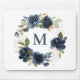 Elegante und skurrile botanische Mousepad. Es verfügt über einen Blumenkranz in Aquarelltönen mit marineblauen Rose und Pfingsten, Grünpflanzen und Imitaten Goldfolienakzente. Anpassen durch Hinzufügen eines Monogramms. Diese blumenblaue Kranzmaus ist ein personalisiertes Geschenk.
