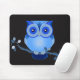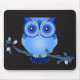 Das Mousepad hat ein blaues monochromatisches Design einer Eule auf einem Zweig mit Blätter.