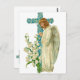 Vintages Gemälde eines Engels in Weiß, der vor einem Blumenkreuz betet.
