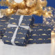 Blaue und goldene Segel Geschenkpackung mit Delphinen in einem Gittermuster.