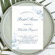 Ein weißer Hintergrund, mit dustigen blauen Eukalyptus-Stielen dekoriert, mit Sprigs. Personalisieren und fügen Sie einen Namen und Party-Details hinzu. Zurück: staubiger blauer Hintergrund.