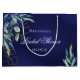 Ein marineblauer Hintergrund. Die blaue Farbe ist ungleichmäßig. Die Einrichtung besteht aus einer Aquarellpflanze mit Eukalyptuspflanzen und goldenem Blattwerk. Personalisieren und fügen Sie ein Datum und den Namen der Braut. Weißer Text. Perfekt für Geschenkverpackungen oder für Vergünstigungen.