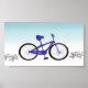 Ein cooles Design mit einem Fahrrad mit blauem Sitz und Rahmen, schwarzen Pedalen und schwarzen Reifen. Ein dunkelblauer Hintergrund. Fügen Sie ein Sprichwort oder einen Slogan nach Wunsch hinzu.