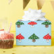 Ein Muster festlicher Pilze aus Cartoon. Eine hat eine Kappe wie ein Weihnachtsbaum und die andere hat eine Kappe wie eine Weihnachtsmannmütze. Der Hintergrund ist hellblau.