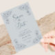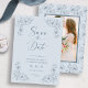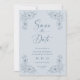 Das Blue Floral Foto besticht Save the Date durch seinen klassischen Charme mit einem staubblauen Hintergrund und einem Vintagen Blumendesign. Das passende Muster und das senkrechte Foto auf der Rückseite sorgen für eine zusätzliche Raffinesse, die Ihre Hochzeitsankündigung elegant und unvergesslich macht. Ideal, um den Ton für Ihre raffinierte und zeitlose Hochzeit zu setzen.
