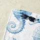 Strandtuch aus blau-weißem Seepferd. Das Design zeichnet sich durch ein wunderschönes Seepferd in blauen Aquarelltönen aus, Set vor einem unberührten, weißen Hintergrund. Dieses Badetuch ist das perfekte Zubehör für einen entspannenden Tag am Meer oder zum Entspannen am Pool.
