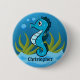 Niedlicher Abzeichen-Button mit einem blauen Seepferd in einer Unterwasserszene. Unten ist eine Vorlage, um Ihren Namen zu personalisieren hinzufügen.